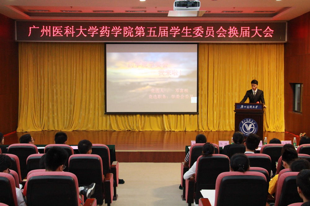 大会首先由第四届学生委员会委员长郑嘉雄宣读《广州医科大学药学院学生委员会章程》,详细介绍药学院学生委员会的工作职责。接下来,由主持人宣读学委会竞选办法;通过总监票员、计票员名单。