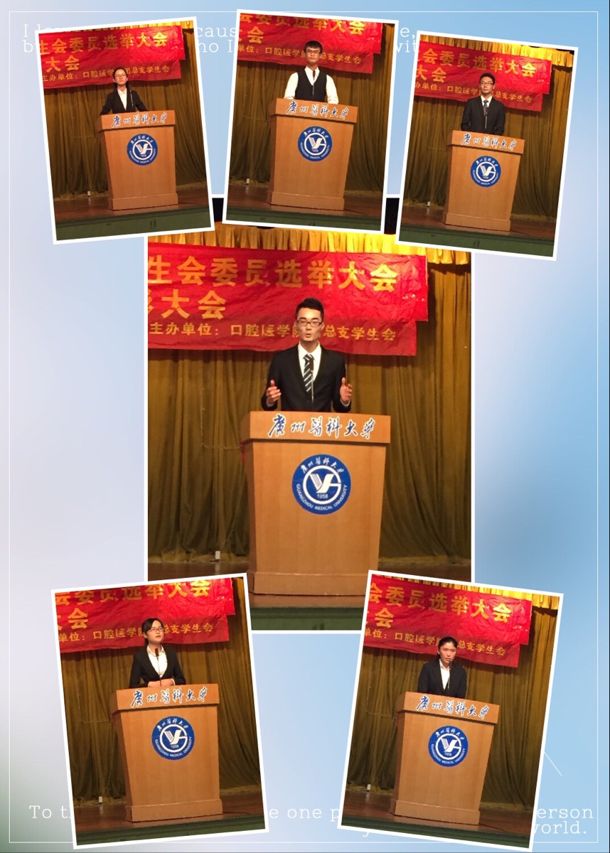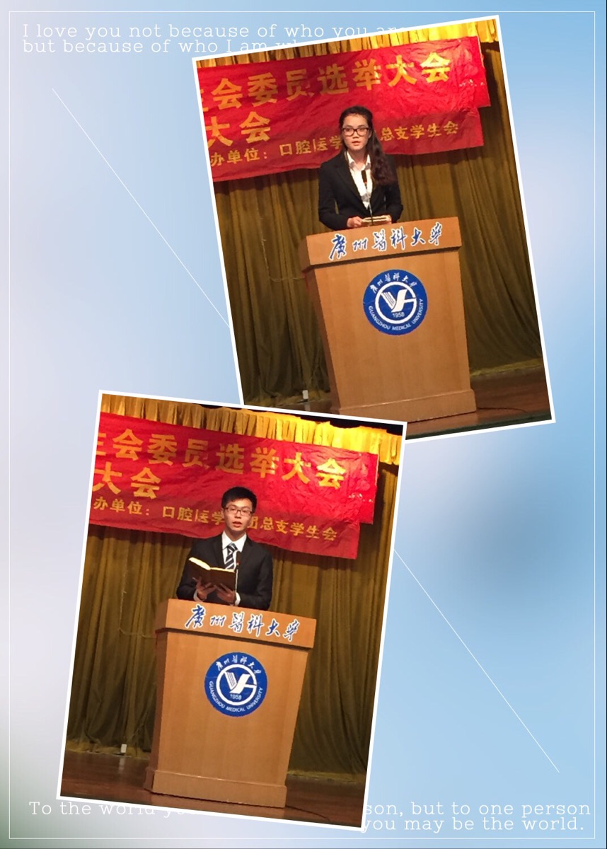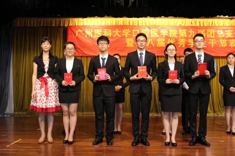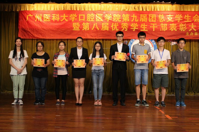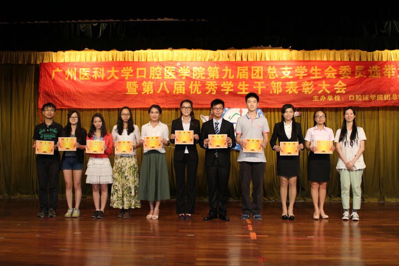 2015年5月24日下午,由广州医科大学口腔医学院党团总支学生会举办的口腔医学院第九届团总支学生会委员选举大会暨第八届优秀学生干部表彰大会,在越秀校区体育馆三楼礼堂隆重举行。出席大会的嘉宾有口腔医学院唐敏仪老师、庄碧贤老师,校友会黄凯波理事,护理学院主席何桂连、卫生管理学院周柏靖主席及第二临床学院学生会副主席李鸿鹄。大会主持人为2014级芮涛和严乐敏同学。